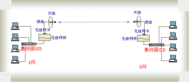 当需要联接的两个有线局域网之间有障碍物遮挡而不能可视时,可以考虑加中继的方案来解决。可以在水平或垂直方向寻找一个可以同时能看到A与B网的位置设置一中继用无线网桥,连接方式与上例一点对两点的大致相同,不同的只是中继点可以有也可以没有有线网。中继点的目的只是为绕过障碍物。